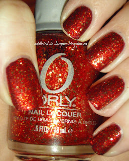 Last up is Devil May Care, I love the name and the look of this glitter polish. full of gold and reddy orange glitter. I wasn't sure how this would apply so this is 2 coats over Rockin' Rockette. However I'm sure this would build up on it's own leaving you with a super glittery-fire look.